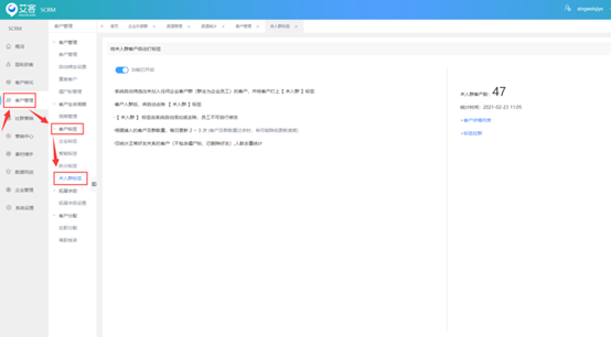 艾客的不在群功提醒功能剛好可以彌補這一漏洞,若企信客戶不在任意一個外部群,開啟不在群自動打標簽功能,將給這個客戶自動打上“未入群”標簽,并統計未入群客戶的數量。用戶入群后該標簽自動剔除。幫助商家能快速找到未入群客戶并可以通過標簽拉群、手動拉群等方式將客戶拉進群。
