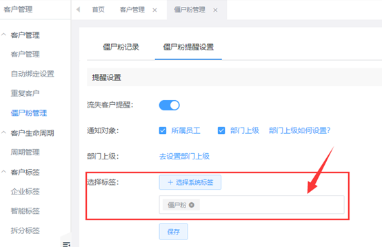 借助艾客SCRM梳理僵尸粉,當客戶刪除員工后,給這個客戶自動打上“標簽”,標簽由商家自定義。通過該功能可以幫助員工快速找到自己的僵尸粉并清除,大大提高了員工工作效率。
