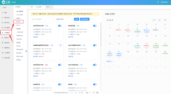 管理員不僅可以利用【艾客SCRM】制定SOP,每日準時提醒員工進行內容推送,還可以將本周、本月的工作安排一早設置在【群日歷】中,讓員工的工作安排一目了然。同時管理員還可以在群日歷中給對應的群添加日歷任務,到達指定時間后系統將自動通知對應的員工去執行對應的任務。