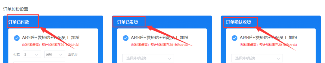 • AI外呼+分配員工加粉:是指有新的訂單收貨手機號時,會導入的手機號進行AI智能外呼,用戶接到電話確定有加好友意向時,接著會將有意向的手機號分配給選中的員工,員工會收到實時提醒,要求員工實時去添加當前這個手機號為好友。