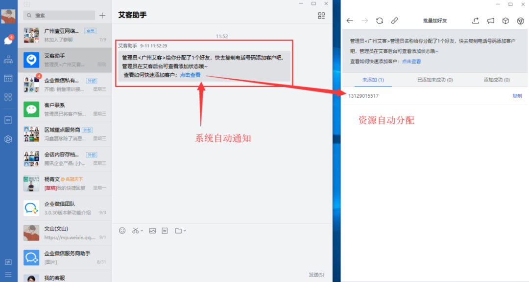在任務時間段內,系統會執行加粉任務,將有意向的手機號通過 “艾客助手” 通知選中的員工。