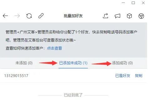 已復制的手機號會進入【已添加未成功】狀態,即等待好友通過狀態。好友通過后會自動變為【添加成功】。員工可以通過此消息彈窗了解自己添加客戶的情況