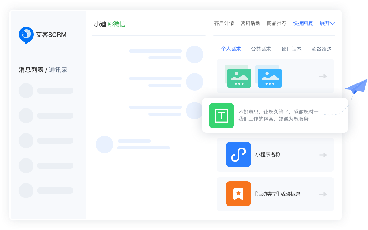 企業支持集中上傳專業話術、產品文檔、視頻圖片等素材內容,員工在和客戶的溝通過程中,可以一鍵發送對應素材,統一對外服務標準,提高客戶滿意度。