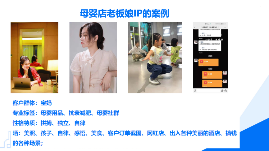 如母嬰店老板娘的自有IP,分享感悟、美照、自律等內容可以形成拼搏、獨立、自律的性格特點,打造值得信任的IP形象。