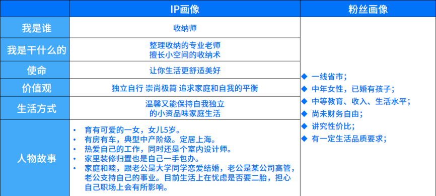 如某收納家居品牌的粉絲數據中,26歲-35歲女性居多,預判已婚人士居多,且多受過較好的教育,收入中等和生活水平中等,可提煉出粉絲畫像為尚未財務自由、講究性價比、大概率有兒女、對品質生活提升有模糊認知但有一定生活品質要求的中產女性,根據畫像可以定位IP畫像為擅長收納的收納師,并設定貼合IP的使命、價值觀、生活方式和人物故事等。