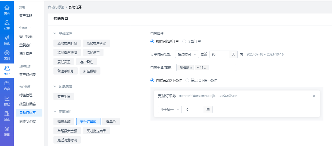 1.篩選客戶,企業(yè)銷售人員需要做的第一件事就是將這部分沉默用戶篩選出來,便于之后實(shí)施“沉默用戶激活SOP”。通過艾客SCRM,企業(yè)可以自定義客戶標(biāo)簽,進(jìn)行標(biāo)簽分類管理,同時(shí)可以利用自動打標(biāo)功能進(jìn)行人群自動化貼標(biāo)。