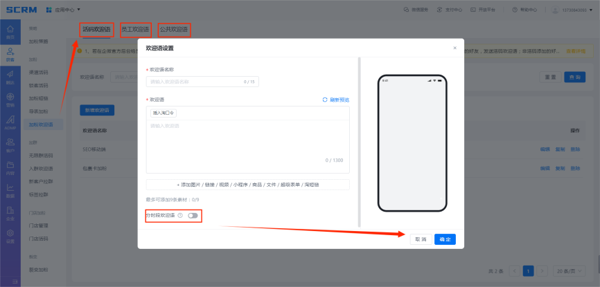 設置新用戶加入后歡迎語,通過活碼加的好友,發送活碼歡迎語;非活碼添加的好友,優先發送員工歡迎語,無員工歡迎語則發送公共歡迎語,滿足加粉多種渠道需求。此外可設置分時段歡迎語,在員工上下班不同時間段可設置不同歡迎語。