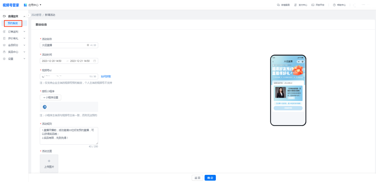 設置用戶參與視頻號直播預約裂變活動需邀請好友數量及獎品,好友預約直播即可助力成功。創建活動后艾客后臺生成短鏈及二維碼,可向私域用戶進行推廣。