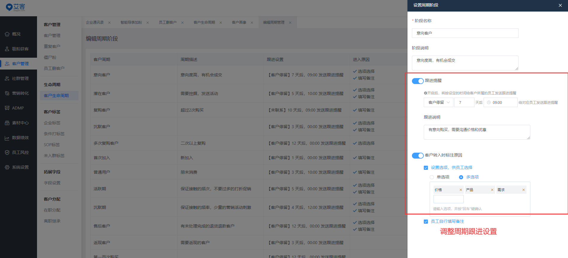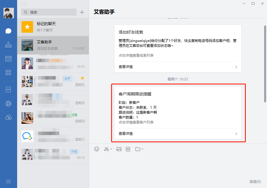 給客戶設置一個完整的客戶生命周期,它可以描述客戶從加企業微信到流失所處的各個發展階段,設置完成后,系統會對企業員工發送跟進提醒。