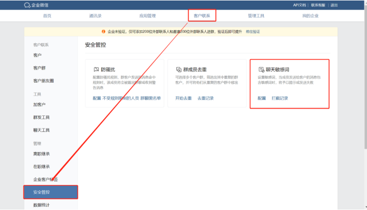 企業(yè)微信敏感詞攔截設(shè)置起來(lái)很簡(jiǎn)單,只需要管理員登錄企業(yè)微信后臺(tái),在【客戶聯(lián)系】—【安全管控】中即可配置規(guī)則適用的員工或客戶,這樣能攔截“加微信”等常見(jiàn)敏感表述,還可以阻止員工發(fā)送手機(jī)號(hào)、紅包等違規(guī)內(nèi)容。