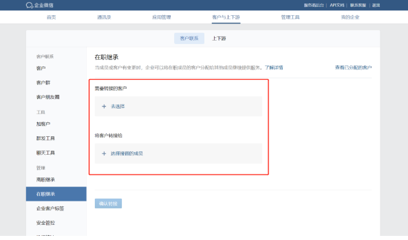 如果使用企微在職繼承,需要管理員在企微后臺【在職繼承】中將客戶分配給其他成員。