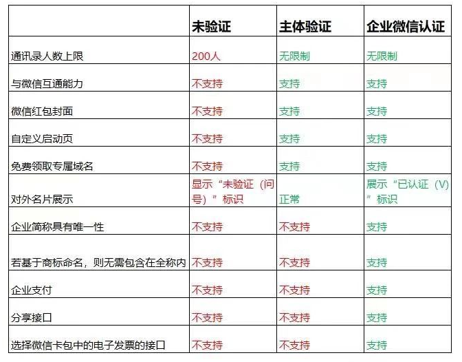 從添加好友數量方面來說,小編是建議企業進行認證的,因為認證過的企業微信能使用的功能多多,而未認證過的企業微信能使用的功能很少。看下圖就可以看出它們的區別。