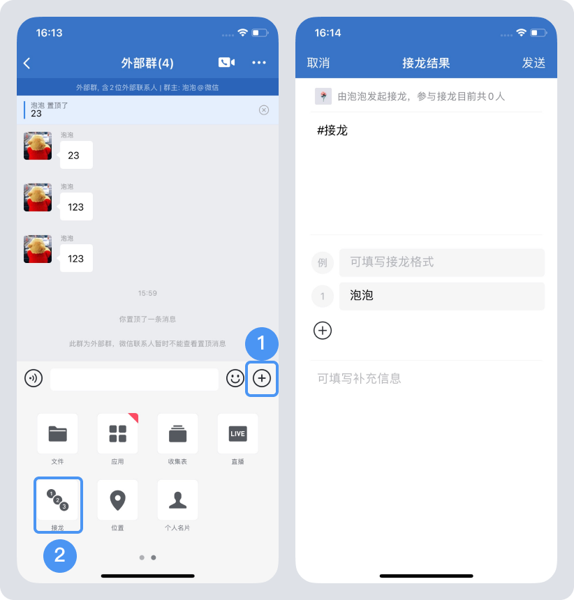 1、手機(jī)端:手機(jī)登錄企業(yè)微信,進(jìn)入外部客戶群群聊會話界面,點(diǎn)擊輸入框最右邊的“+”,選擇下方的“接龍”圖標(biāo),就可以發(fā)起接龍了。而群內(nèi)成員想要參與接龍,直接點(diǎn)發(fā)起人發(fā)起接龍下方的“參與接龍”即可參與。