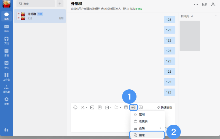 2、電腦端:登錄電腦端企業(yè)微信,進(jìn)入外部群群聊頁面,在輸入框上面的工具欄中點(diǎn)擊圓形內(nèi)有三個點(diǎn)的那個符號,從這些應(yīng)用中找到“接龍”選項(xiàng),點(diǎn)擊接龍就可以發(fā)起接龍了。