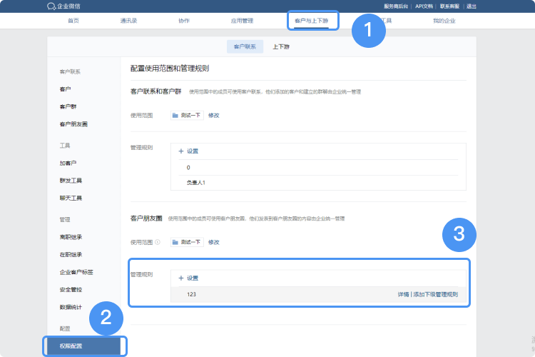 1、電腦端:企業微信管理員登錄企業微信后臺,“客戶與上下游”——“客戶聯系”——“權限配置”——“朋友圈管理規則”,就可以對管理規則進行設置或者添加下級管理規則了。