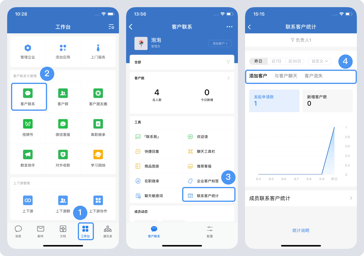 企業微信自帶的“聯系客戶統計”功能,可以清楚知道客戶流失情況,企業只要通過登錄手機端企業微信,在“工作臺”——“客戶聯系”——“聯系客戶統計”,就可以查看某個時間端內的添加客戶數,與客戶聊天數,客戶流失數了,這個查看的時間段可以靈活自定義進行設置。
