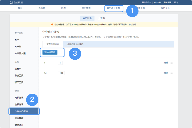 (1)企業微信管理員登錄企業微信后臺,“客戶與上下游”——“客戶聯系”——“企業客戶標簽”。