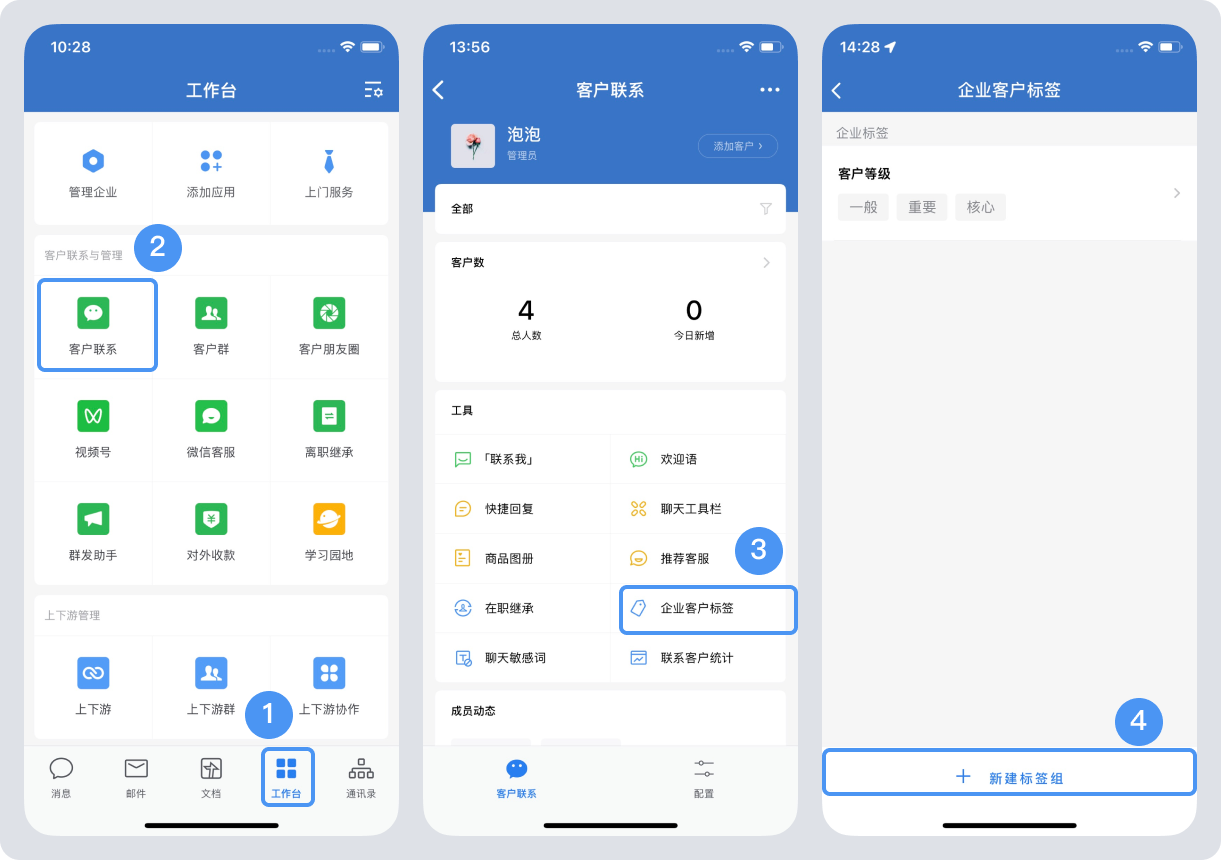 (2)業務負責人登錄手機端企業微信,“工作臺”——“客戶聯系”——“企業客戶標簽”——“新建標簽組”。