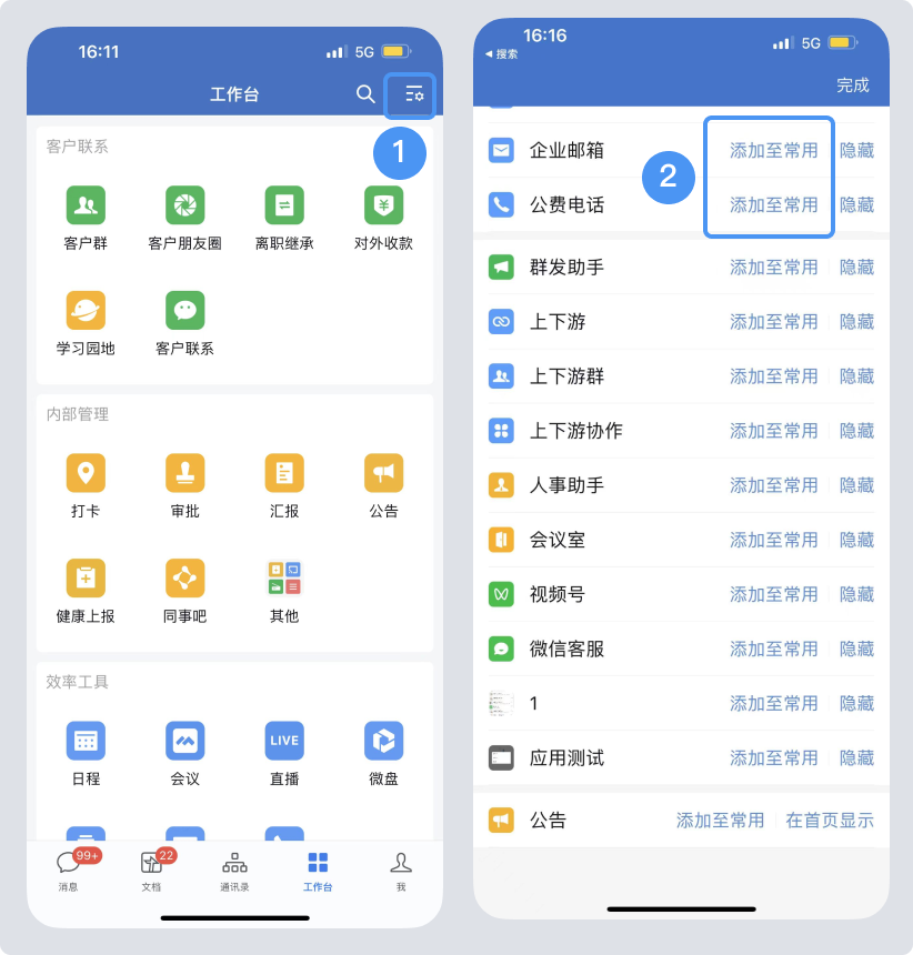 以手機端企業微信為例,登錄手機端企業微信后,點擊工作臺,右上角在搜索符號旁邊有三個橫杠,點擊它,把常用的程序添加至常用,就可以把這些應用添加到工作欄中的常用欄里了。