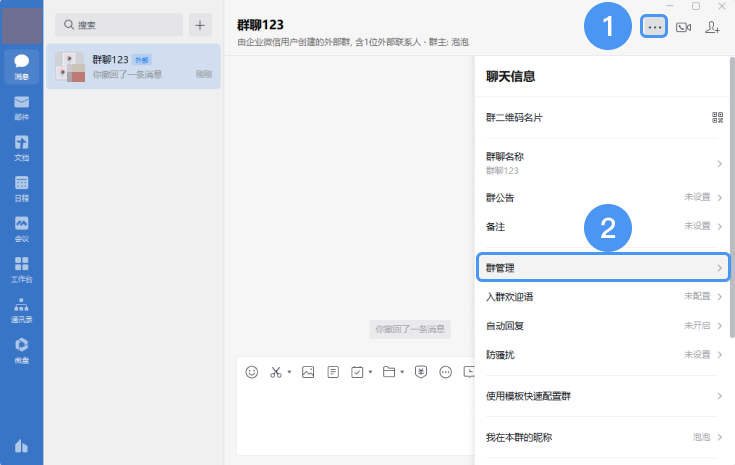 2、電腦端:群主登錄電腦端企業微信,進入到腰解散的群聊會話頁面,點擊群聊右上角的“...”,選擇“群管理”,選擇“解散”即可。