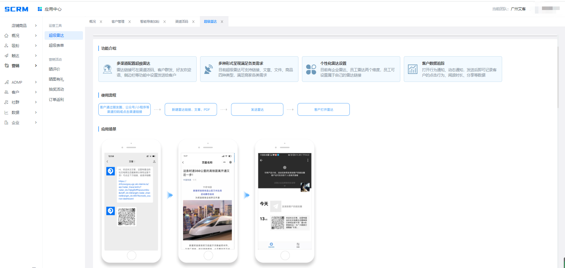 最近,在與朋友交談中,說到他們企業在使用超級雷達功能,可以全面記錄客戶的行為數據,聽起來非常的吸引人,但是有些朋友在使用過程中,還是不太清楚超級雷達有什么作用?超級雷達適合應用場景有哪些?下面我們一起來了解下吧!