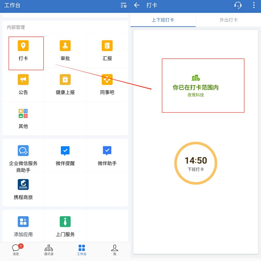 企業員工只需要登錄手機端企業微信,在“工作臺”——“打卡”,就可以在打卡設置的時間范圍內進行上下班打卡了。
