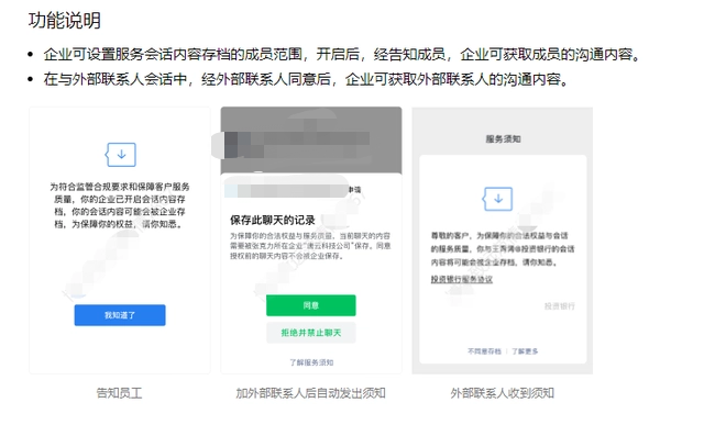 當(dāng)企業(yè)管理者給員工開通會話存檔功能后,員工進(jìn)入企業(yè)微信就會彈出會話存檔提示框,并且在與客戶聊天開始時,會在聊天窗口彈出一條“服務(wù)須知”。