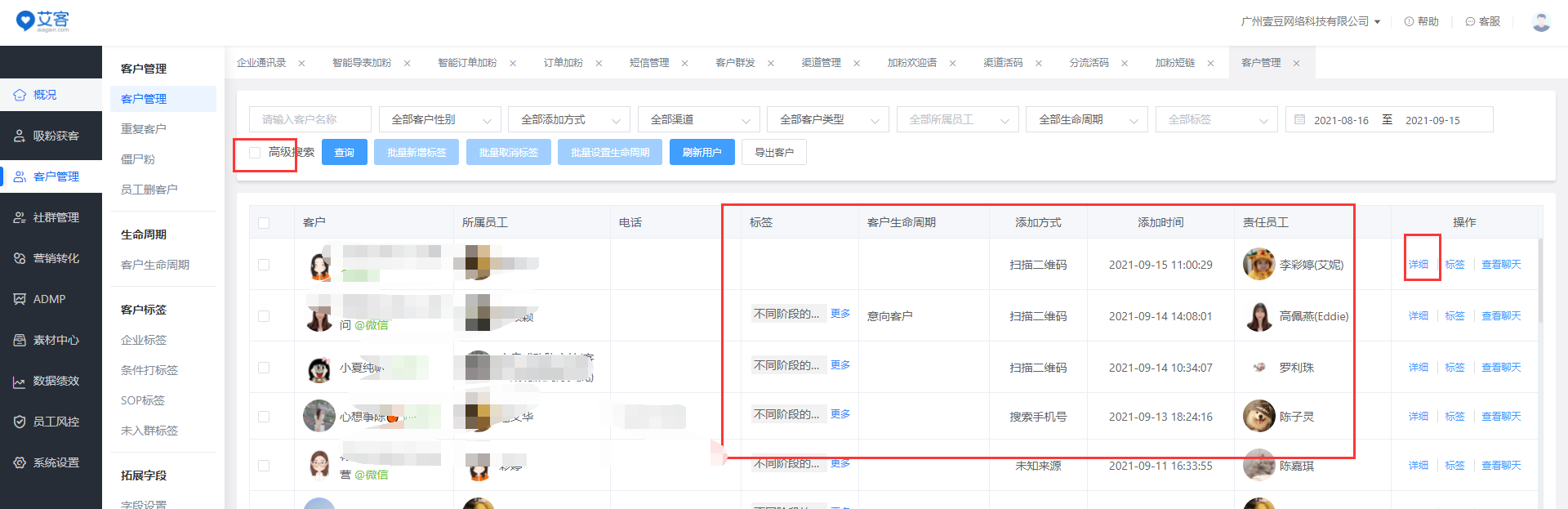 使用艾客的【客戶生命周期】功能,它能牢牢把握住客戶從加企業微信好友開始到流失所處的各個發展階段。并且在客戶管理功能中,還能查看各個客戶周期階段的分布記錄以及查看與客戶的聊天記錄。企業可以清晰了解哪些是沉睡客戶。