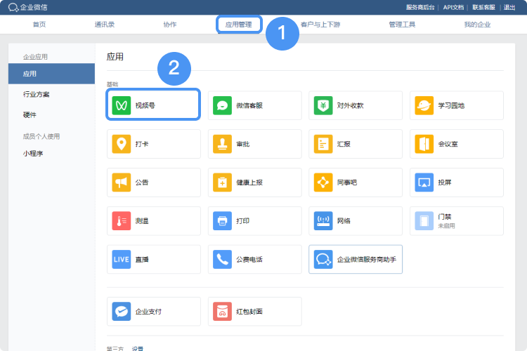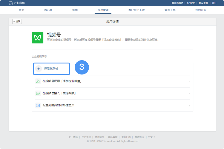(2)企業管理員也可以在企業微信管理后臺的【應用管理】-【視頻號】中進行綁定。具體操作如下圖: