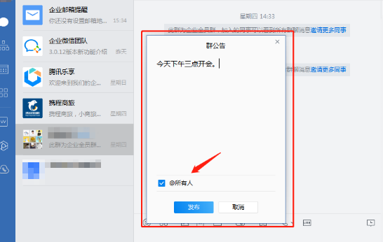 只需點擊“寫群公告”,就可以在空白的位置編輯通知內(nèi)容,最后點擊發(fā)布即可。如果想提醒所有成員,勾選下方的“@所有人”即可。