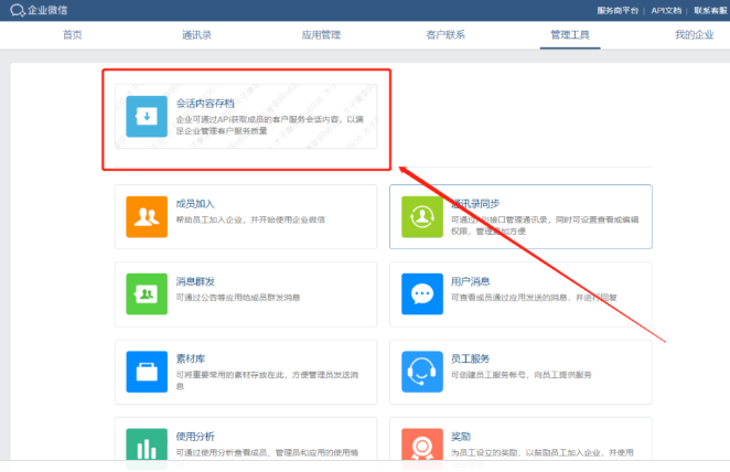 而設(shè)置會話內(nèi)容存檔功能的入口就在企業(yè)微信管理后臺,具體如圖所示: