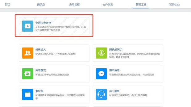 企業微信會話存檔在企業微信后臺的“管理工具”中就能查看此項功能,點擊“會話內容存檔”,下載會話存檔確認函,填寫好各種信息,蓋章后上傳確認函,由企業微信官方進行審核即可,審核時間需要1到2個工作日。