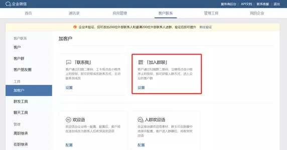 企業(yè)微信可以通過企業(yè)微信管理后臺進行設置群活碼,通過“客戶聯(lián)系”——“加客戶”——“加入群聊”——“創(chuàng)建群聊”——“通過二維碼加入群聊”即可生成群活碼。