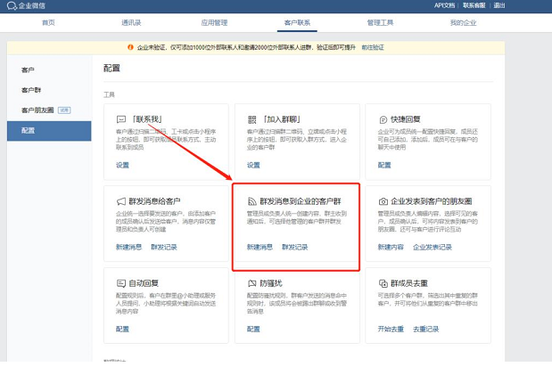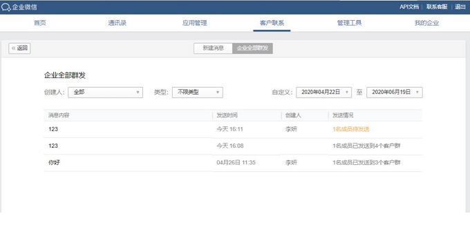 而且管理員在后臺的【客戶聯(lián)系】—【配置】—【群發(fā)消息到企業(yè)的客戶群】—【群發(fā)記錄】中,可以查看員工發(fā)送企業(yè)群發(fā)消息的進(jìn)度。