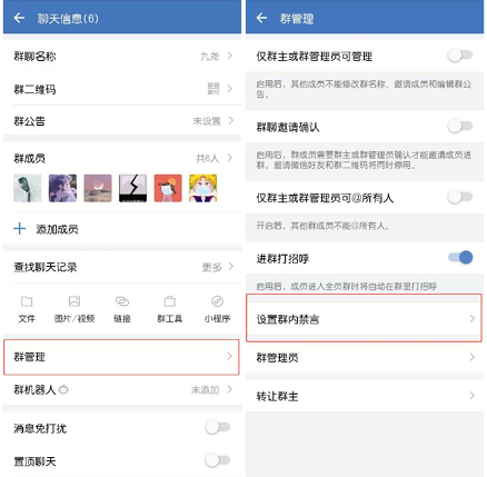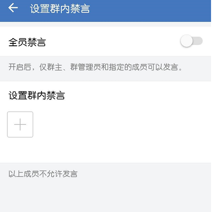 在設置群禁言時,能選擇一鍵全員禁言,一旦開啟后只有群主、管理員或指定群成員才能進行群聊發言,其他群成員在禁言解除前無法發言,也能設置單獨禁言部分群成員。