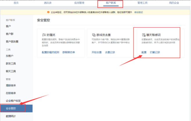 企業(yè)微信設置敏感詞的操作很簡單,只要管理員進入企微管理后臺,在【客戶聯(lián)系】—【安全管控】中就可以找到聊天敏感詞。