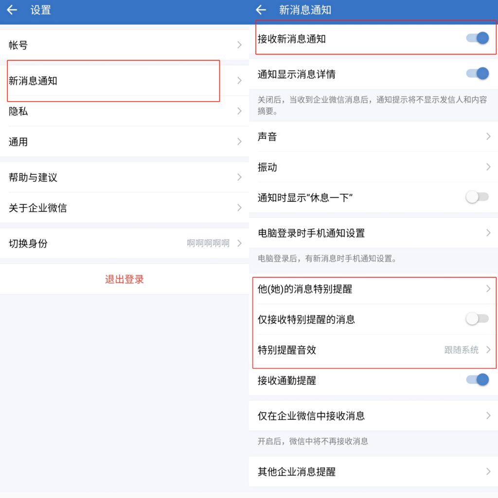 在登錄企業(yè)微信手機(jī)端的時(shí)候,也可以進(jìn)入“設(shè)置”里進(jìn)行設(shè)置,在“新消息通知”中的“接收新消息通知”和“通知顯示消息詳情”都打開(kāi)即可。對(duì)于特別消息提醒,可以不用開(kāi)“接收特別提醒的消息”,只要單獨(dú)給其開(kāi)一個(gè)比較特別的提示音效,這樣也不會(huì)錯(cuò)失特別的消息提醒。