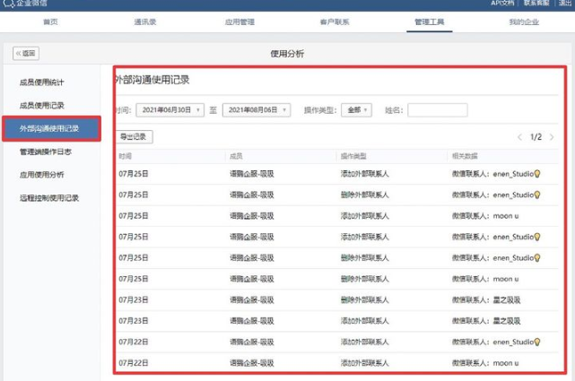 管理員可以登錄企業微信管理后臺,在【管理工具】—【使用分析】—【外部溝通使用記錄】中查看員工刪除客戶詳情。