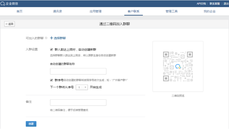 企業微信自帶群活碼功能,群活碼生成的步驟是:登錄企業微信后臺,在上方那一欄里找到“客戶聯系”,點擊“加入群聊”,就可以新建群聊了,再選擇“通過二維碼加入群聊” ,接下來就可以創建群活碼了。里面的入群設置可以勾選“群人數達上限時,自動創建新群”選項,設置好群聊名稱,設置好群序號和備注等相關內容,點擊“創建”即可。
