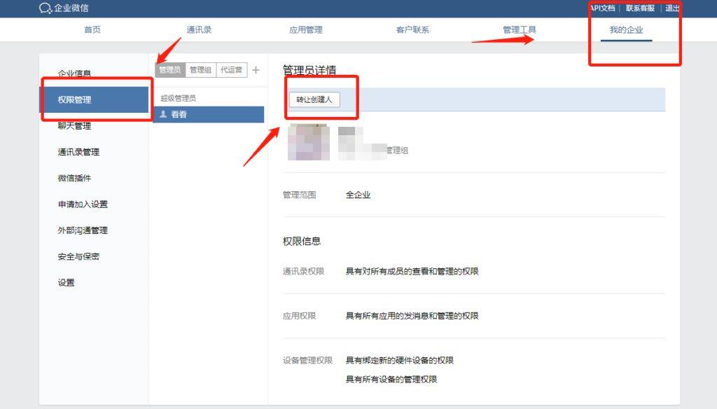 雖然企業微信創建者身份不支持解除,但是有需要,是可以進行身份轉讓的,可以通過登錄企業微信后臺,在【我的企業】-【管理權限】頁面選擇更換創建人。創建人使用企業微信掃碼確認身份后,即可輸入成員姓名或賬號,進行創建者轉讓。