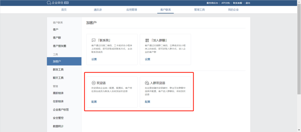 入群歡迎語:企業管理員登錄企業微信后臺,在“客戶聯系”——“加客戶”中就可以配置相關的入群歡迎語了。