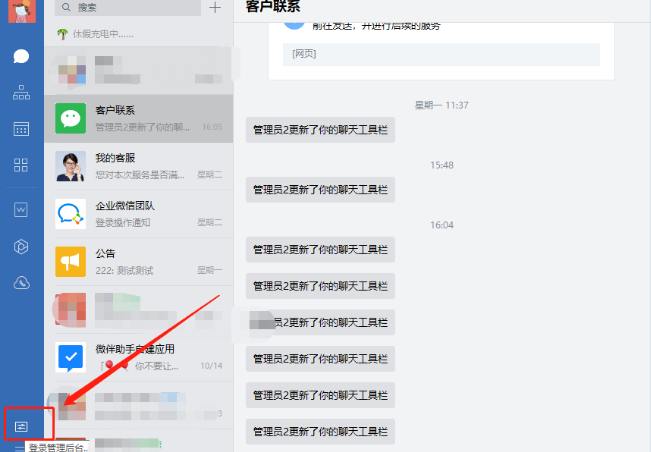 其實除了這種方式,我們還能使用另一種方式登錄,若登錄了電腦企業微信,還能點擊企微側邊欄的登錄管理后臺按鈕,從企業微信中跳轉到管理后臺,不需要掃碼登錄。不過這個按鈕不是很明顯,不知道大家是否發現呢?