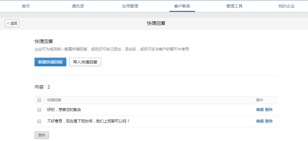 需要注意的是企業管理員在企業微信后臺設置的快捷回復和員工個人在前臺設置的快捷回復,它們之間是混合在一起的。