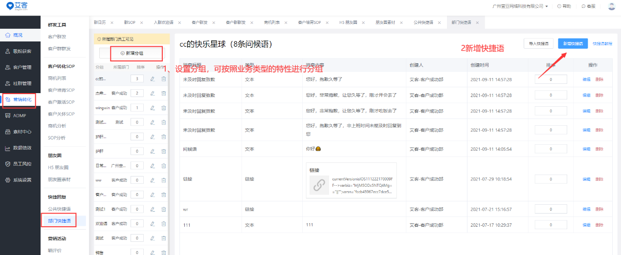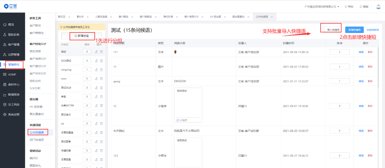企業可以使用艾客SCRM系統的公共快捷語,它支持快捷語以文本、圖片、視頻、鏈接、文件的形式出現,能讓企業所有的子賬號都可以使用。讓員工能快速回復,提升溝通效率,保證信息標準化。