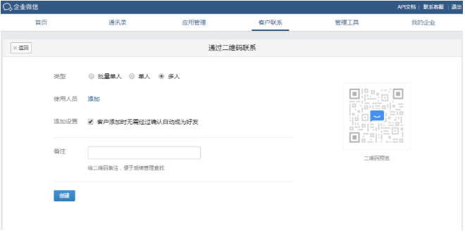 企業微信活碼需在企業微信管理后臺中創建,企業管理員點擊管理后臺,選擇【客戶聯系】—【配置】—【聯系我】—【新建聯系人方式】—【通過二維碼聯系】,就能在頁面中設置使用人員,再生成一個活碼。