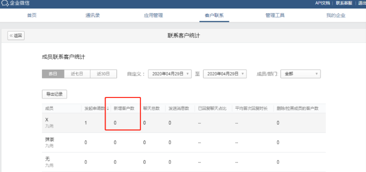 企業微信活碼創建完成后,企業可以將其投入到各個渠道中。使用后,管理員能在企微管理后臺的【客戶聯系】—【配置】—【聯系客戶統計】—【成員聯系客戶統計】中查看近期客戶新增情況。