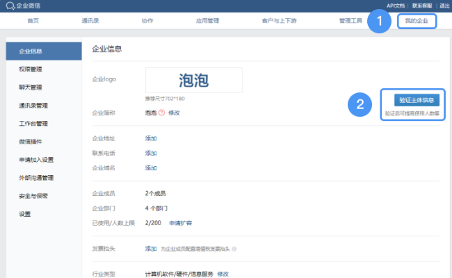 登錄管理端企業微信,在“我的企業”——“企業信息”——“驗證主體信息”——“通過微信公眾號授權驗證”即可。