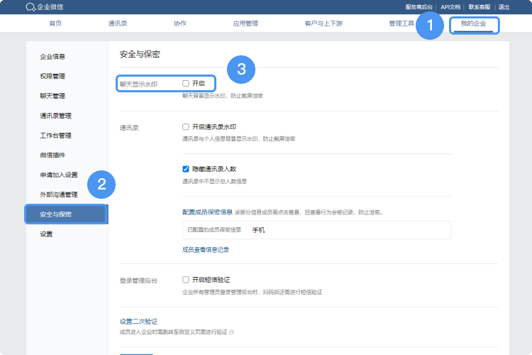 設置聊天顯示水印步驟為:企業微信管理員登錄企業微信后臺,在“我的企業”——“安全與保密”——“開啟聊天顯示水印”即可。