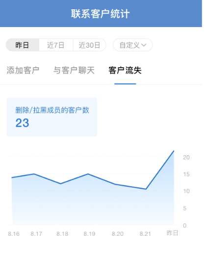企業(yè)微信自帶的功能是無(wú)法查看刪除的客戶情況的,只能知曉客戶流失的總數(shù),以及一段時(shí)間范圍內(nèi)的客戶流失數(shù)量。可以通過(guò)手機(jī)端企業(yè)微信進(jìn)行查看,從“工作臺(tái)——客戶聯(lián)系——聯(lián)系客戶統(tǒng)計(jì)——客戶流失”內(nèi)查看客戶流失數(shù)據(jù)。