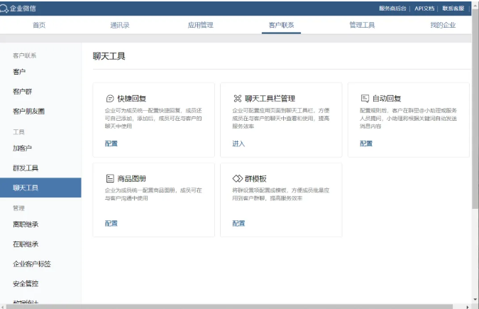配置路徑:【企業微信管理后臺】—【客戶聯系】—【聊天工具】—【自動回復】。超級管理員需在管理后臺【客戶聯系】中新建【自動回復】功能,業務負責人不支持設置這個回復規則。